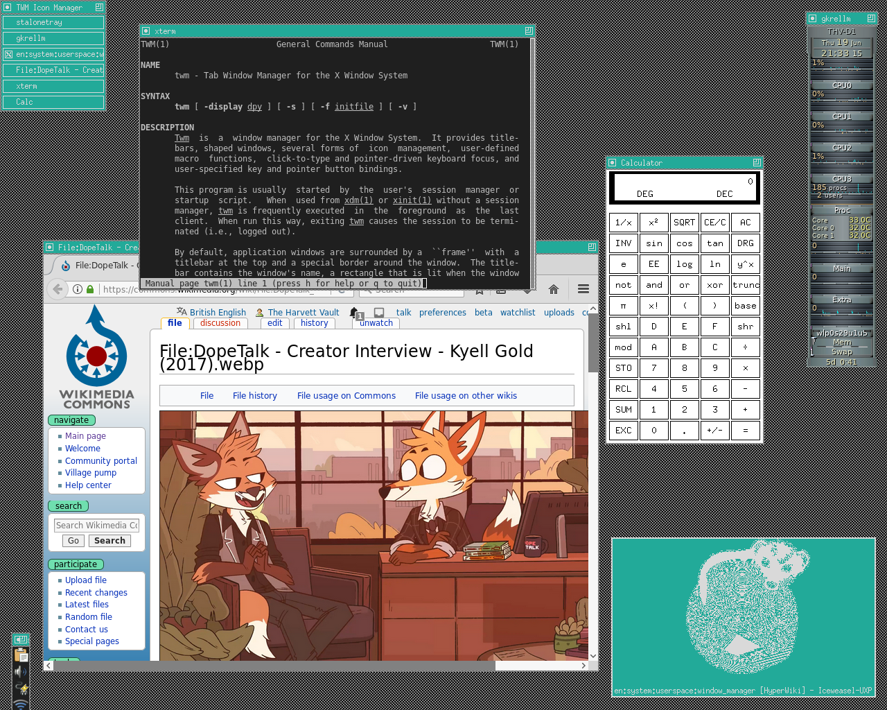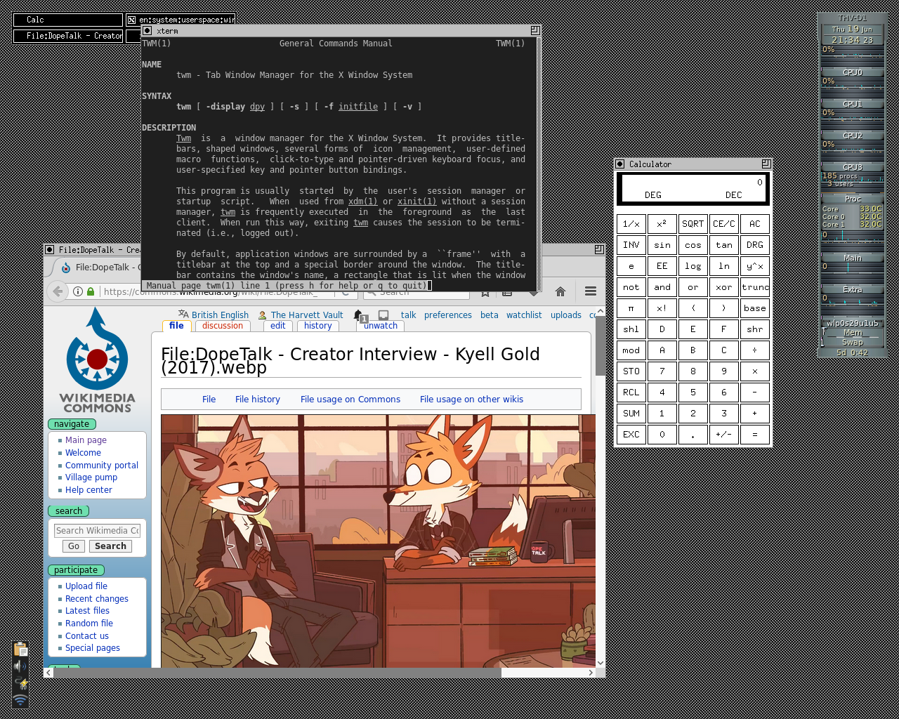 I also made a system.twmrc file as the rebranding to replace the original one to make twm look better. The original one was dull and messy. For example, the icons for modern applications in the minimized state had become garbled in monochrome. Here are two screencaps comparing how they look with the default font change.